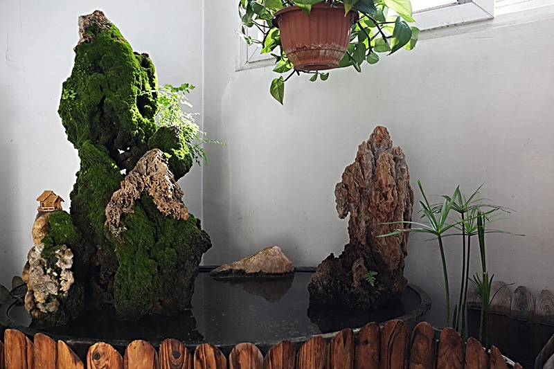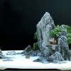 山水盆景是以觀賞巖石為主的一類盆景。制作山水盆景,首先必須進行藝術構思,確定主題,然后按照山石的天然氣質,取其全部或局部適宜造型的石料,并以植物及必要配件進行人工雕琢,配置成假山。將奇峰異巒、高峽飛漾、百嶂千峰、洞幽奇景等自然景色,濃縮到淺盆中,盛在幾案上,儼如一幅立體山水畫,使人如臨碧波綠水之前、名山大川之間,意趣盎然。 分類 水盆型把山石置于淺口水盆中,盆中盛水不盛土. 旱盆型淺盆中有山石而不放水,植物及配件點綴在山石上,但需要保持濕潤. 水旱型淺盆中一部分是土壤、山石、樹木、而另一部分是水。 石料的選擇 制作山水盆景的基本材料主要是山石。我國地大物博,山石的種類繁多,常用的山石約有三十多種,基本上可分為松質和硬質兩大類。松質的吸水性好,容易加工雕琢造型;硬質的則質地堅硬而不吸水,不易加工。不管松質或硬質山石,制作山水盆景的石料必須具有天然紋理、色彩以及形態自然等特點。 (1)砂積石 砂積石呈灰褐色或土黃色,因產地不同,不但色澤有深淺之分,而且質地的松硬程度也有差別。一般來講,砂質石質輕而松,可根據需要,隨心所欲地雕出各種形態的峰、洞、巖以及紋理等,還因其吸水性好,栽種植物易于生長,因此,這種松質石是制作山水盆景最常用的石料之一。但這種石料也有缺點,日子久了容易風化。這種石多產于浙江、安徽、四川、河北、山東等地。 (2)蘆管石 (也稱麥稈石) 蘆管石同砂積石的質地、顏色及產地基本相同。蘆管石有粗有細,有天然形成的管狀小孔和奇峰異洞。選取該石時,應取其自然、完整的部分,稍為加工便可成型。但加工時要特別小心,否則蘆管斷裂便影響自然美。 (3)浮石 浮石是玄武巖的一種,由火山噴發的巖漿冷凝而成,顏色有灰、灰黃、灰白等色,質地疏松,內部有較均勻的小孔,能浮于水面,吸水性好,用小刀可隨意雕刻出各種形態。此石產于東北的吉林長白山以及黑龍江等地。 (4)海母石 海母石是一種貝殼類的沖積化石,因多產于海水中,含有較多的鹽份,需要用清水浸洗一段較長的時間,去其鹽份,才可附植小草木。該石質地疏松,便于改造,吸水性也好。這種石多產于海濱。 (5)鐘乳石 鐘乳石多產于廣東、廣西等各地巖洞,多為白色或微黃色,經過長期自然巖溶而形成柱狀、錐狀等各種形狀,質地較疏松,鋸截較方便。 (6)英石 英石盛產于廣東英德一帶。據《韶州府志》描述:“英石如芙蓉亂削,乳竇交通,p54巖勾漏,無不奇巧玲瓏”。其顏色以灰黑色為多,間有白色、淺綠色和帶白紋理的雜色。有天然形成的正背石,背石較平坦,正面紋理自然,富于變化。質地堅硬,不吸水,不易破碎,但加工較困難。在選擇英石時,以崢嶸、多孔、嶙峋,天然形成的為最佳。 (7)靈壁石 靈壁石質地堅硬,叩之有金屬聲,有黑色、白色,其中也夾雜有黑、白、赭、綠等色,俗稱五彩,多產于安徽省的靈壁縣。 (8)蠟石 蠟石無整體的巖層,多以獨石存于山中。在我國南方各式各地高溫多濕的山坑里,經常被水沖擊,形成各種形態,質地堅硬,不能加工造型,只能以獨石擺設。色有深黃、淺黃、白等。全石以無損壞、無雜質、表面滑凈而有光澤及以竇穴奇形怪狀的為珍品。 (9)斧劈石 斧劈石質硬而脆,顏色有多種,有深灰、淺灰、灰黑色和土黃色等。這種石具有絲狀或片狀的紋理。順其紋理,略施斧鑿或鋸截,加工整形,可表現懸崖峭壁或高聳入云、雄偉挺拔的山峰。此石產于江蘇一帶。 (10)木化石 木化石即古代樹木的化石,質地堅硬,加工較困難。顏色有黃褐色和深灰色。它是制作石山盆景的良好石料。 除上述常用的石料外,還有其他巖石,如產于廣東花縣的菊花石、芙蓉石,肇慶的端石和白星巖石,浙江的松皮石、石筍,四川的龜紋石、雞骨石等等,也可作山水盆景的材料。 石山的布局 山水盆景是運用移天縮地、以小見大的藝術手法,根據“一峰則太華千尋,一勺則江湖萬里”的原則來造型和布局的。山水盆景以山為主,成功的石山必須是既具形態美和雄偉的山勢,又有皺、瘦、透、漏之妙。“皺”就是要求石上表面有紋理,皺褶得有規律,不宜平滑;“瘦”就是要求石塊稍長,頂端較寬有棱角,不宜臃腫;“透”就是指石塊里面有大小孔道,互相溝通;“漏”是指石料要有孔隙,能夠通氣排水。我們在選擇石料制作盆景時,主要是要根據石的特點來確定主題。如修直挺拔、呈懸崖峭壁的,可用來制作險峰;呈扁長形狀的,可用來表現連綿不斷的山巒;皺、瘦、透、漏皆備的,不但可作云峰、洲島、土山,還可作獨石欣賞。如何充分利用石的自然形態進行布局、組拼安排,有下面三種方法可供參考。 ①獨石。獨石俗稱孤峰,在盆內的左邊或右邊安置一塊較大的石峰,另一側放置一兩塊小石作島嶼,這樣大山、小島大小懸殊,各在其位,形成一峰異起于遼闊水面上的景致,此景蘊含深遠,主題集中。這種石料以不用人工加工而自然形成的獨石為佳。 ②子母石。在盆內設置兩塊一大一小的石峰,左右對峙,母石(主峰)突出,略偏于盆的任意一方,但不能立于盆的中央,這樣母石在主位,子石作陪襯,子、母石高矮不一,大小各異,賓主分明。兩石隔水相望,遙相呼應,既對立又統一,既簡練又符合天然山水的真實性。 ③群石。這種石山狀如“眾如拱伏,主山始尊”。盆內山幾座較大的石山組成,群石中的主山必須擺設在重要的位置上,其