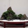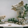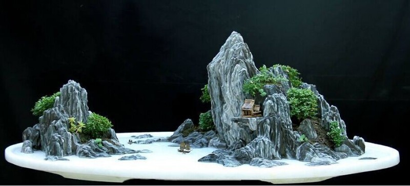 山水盆景是以觀賞巖石為主的一類盆景。制作山水盆景,首先必須進行藝術構思,確定主題,然后按照山石的天然氣質,取其全部或局部適宜造型的石料,并以植物及必要配件進行人工雕琢,配置成假山。將奇峰異巒、高峽飛漾、百嶂千峰、洞幽奇景等自然景色,濃縮到淺盆中,盛在幾案上,儼如一幅立體山水畫,使人如臨碧波綠水之前、名山大川之間,意趣盎然。 分類 水盆型把山石置于淺口水盆中,盆中盛水不盛土. 旱盆型淺盆中有山石而不放水,植物及配件點綴在山石上,但需要保持濕潤. 水旱型淺盆中一部分是土壤、山石、樹木、而另一部分是水。 石料的選擇 制作山水盆景的基本材料主要是山石。我國地大物博,山石的種類繁多,常用的山石約有三十多種,基本上可分為松質和硬質兩大類。松質的吸水性好,容易加工雕琢造型;硬質的則質地堅硬而不吸水,不易加工。不管松質或硬質山石,制作山水盆景的石料必須具有天然紋理、色彩以及形態自然等特點。 (1)砂積石 砂積石呈灰褐色或土黃色,因產地不同,不但色澤有深淺之分,而且質地的松硬程度也有差別。一般來講,砂質石質輕而松,可根據需要,隨心所欲地雕出各種形態的峰、洞、巖以及紋理等,還因其吸水性好,栽種植物易于生長,因此,這種松質石是制作山水盆景最常用的石料之一。但這種石料也有缺點,日子久了容易風化。這種石多產于浙江、安徽、四川、河北、山東等地。 (2)蘆管石 (也稱麥稈石) 蘆管石同砂積石的質地、顏色及產地基本相同。蘆管石有粗有細,有天然形成的管狀小孔和奇峰異洞。選取該石時,應取其自然、完整的部分,稍為加工便可成型。但加工時要特別小心,否則蘆管斷裂便影響自然美。 (3)浮石 浮石是玄武巖的一種,由火山噴發的巖漿冷凝而成,顏色有灰、灰黃、灰白等色,質地疏松,內部有較均勻的小孔,能浮于水面,吸水性好,用小刀可隨意雕刻出各種形態。此石產于東北的吉林長白山以及黑龍江等地。 (4)海母石 海母石是一種貝殼類的沖積化石,因多產于海水中,含有較多的鹽份,需要用清水浸洗一段較長的時間,去其鹽份,才可附植小草木。該石質地疏松,便于改造,吸水性也好。這種石多產于海濱。 (5)鐘乳石 鐘乳石多產于廣東、廣西等各地巖洞,多為白色或微黃色,經過長期自然巖溶而形成柱狀、錐狀等各種形狀,質地較疏松,鋸截較方便。 (6)英石 英石盛產于廣東英德一帶。據《韶州府志》描述:“英石如芙蓉亂削,乳竇交通,p54巖勾漏,無不奇巧玲瓏”。其顏色以灰黑色為多,間有白色、淺綠色和帶白紋理的雜色。有天然形成的正背石,背石較平坦,正面紋理自然,富于變化。質地堅硬,不吸水,不易破碎,但加工較困難。在選擇英石時,以崢嶸、多孔、嶙峋,天然形成的為最佳。 (7)靈壁石 靈壁石質地堅硬,叩之有金屬聲,有黑色、白色,其中也夾雜有黑、白、赭、綠等色,俗稱五彩,多產于安徽省的靈壁縣。 (8)蠟石 蠟石無整體的巖層,多以獨石存于山中。在我國南方各式各地高溫多濕的山坑里,經常被水沖擊,形成各種形態,質地堅硬,不能加工造型,只能以獨石擺設。色有深黃、淺黃、白等。全石以無損壞、無雜質、表面滑凈而有光澤及以竇穴奇形怪狀的為珍品。 (9)斧劈石 斧劈石質硬而脆,顏色有多種,有深灰、淺灰、灰黑色和土黃色等。這種石具有絲狀或片狀的紋理。順其紋理,略施斧鑿或鋸截,加工整形,可表現懸崖峭壁或高聳入云、雄偉挺拔的山峰。此石產于江蘇一帶。 (10)木化石 木化石即古代樹木的化石,質地堅硬,加工較困難。顏色有黃褐色和深灰色。它是制作石山盆景的良好石料。 除上述常用的石料外,還有其他巖石,如產于廣東花縣的菊花石、芙蓉石,肇慶的端石和白星巖石,浙江的松皮石、石筍,四川的龜紋石、雞骨石等等,也可作山水盆景的材料。 石山的布局 山水盆景是運用移天縮地、以小見大的藝術手法,根據“一峰則太華千尋,一勺則江湖萬里”的原則來造型和布局的。山水盆景以山為主,成功的石山必須是既具形態美和雄偉的山勢,又有皺、瘦、透、漏之妙。“皺”就是要求石上表面有紋理,皺褶得有規律,不宜平滑;“瘦”就是要求石塊稍長,頂端較寬有棱角,不宜臃腫;“透”就是指石塊里面有大小孔道,互相溝通;“漏”是指石料要有孔隙,能夠通氣排水。我們在選擇石料制作盆景時,主要是要根據石的特點來確定主題。如修直挺拔、呈懸崖峭壁的,可用來制作險峰;呈扁長形狀的,可用來表現連綿不斷的山巒;皺、瘦、透、漏皆備的,不但可作云峰、洲島、土山,還可作獨石欣賞。如何充分利用石的自然形態進行布局、組拼安排,有下面三種方法可供參考。 ①獨石。獨石俗稱孤峰,在盆內的左邊或右邊安置一塊較大的石峰,另一側放置一兩塊小石作島嶼,這樣大山、小島大小懸殊,各在其位,形成一峰異起于遼闊水面上的景致,此景蘊含深遠,主題集中。這種石料以不用人工加工而自然形成的獨石為佳。 ②子母石。在盆內設置兩塊一大一小的石峰,左右對峙,母石(主峰)突出,略偏于盆的任意一方,但不能立于盆的中央,這樣母石在主位,子石作陪襯,子、母石高矮不一,大小各異,賓主分明。兩石隔水相望,遙相呼應,既對立又統一,既簡練又符合天然山水的真實性。 ③群石。這種石山狀如“眾如拱伏,主山始尊”。盆內山幾座較大的石山組成,群石中的主山必須擺設在重要的位置上,其