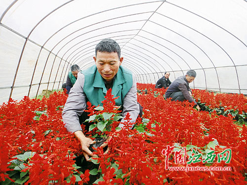 近日,新干縣神政橋鄉花卉苗木基地,花農正搬移盆花準備銷往市場。近年來,新干縣出臺鼓勵政策,全力發展花卉苗木產業。目前,全縣已發展花卉苗木4萬余畝,年創產值6億元,近2萬名花農從中受益、脫貧致富。