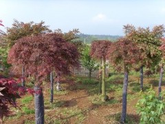 本基地長期低價供應各種規格紅楓、羽毛楓、櫻花、五針松、羅漢松、紅白黃玉蘭、廣玉蘭、垂絲海棠、桂花、茶花等綠化苗木,價格實在,苗圃直銷,歡迎新老客戶來電咨詢、實地看苗選苗!羽毛楓是園藝品種,為落葉灌木,株高一般不超過4米,樹冠開展;枝略下垂,新枝紫紅色,成熟枝暗紅色;嫩葉艷紅,密生白色軟毛,葉片舒展后漸脫落,葉色亦由艷麗轉淡紫色甚至泛暗綠色;葉片掌狀深裂達基部,裂片狹適羽毛裂,有皺紋,人秋逐漸轉紅。其他特征同雞爪槭。
