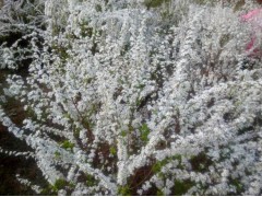 珍珠繡線菊(學名:Spiraea thunbergii Bl.):薔薇科、繡線菊屬灌木,高可達1.5米;枝條呈弧形彎曲細長開張,小枝有稜角,無毛;葉片線狀披針形,基部狹楔形,葉柄極短或近無柄,傘形花序無總梗,花3-7朵,基部簇生數枚小形葉片;萼筒鐘狀,萼片三角形或卵狀三角形,花瓣倒卵形或近圓形,白色;花盤圓環形,子房無毛或微被短柔毛,蓇葖果開張,4-5月開花,7月結果。