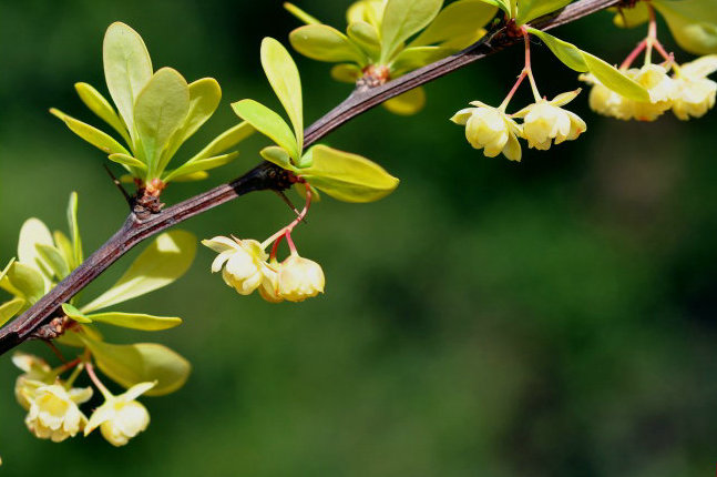 金葉小檗為小檗的一個變種,落葉灌木。幼枝金黃有棱角,葉片全年金黃色,花黃色下垂,紅色漿果長橢圓形。尤其是春夏之交更為鮮艷。適應性強,喜光、耐半蔭、耐旱、耐寒,對土壤要求不嚴;東北南部,華北、華東等大部分地區都能生長。具有極高的觀賞價值。