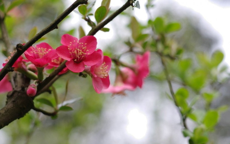 貼梗海棠為薔薇科、木瓜屬落葉灌木,高可達2米,花3朵至5朵簇生于2年生老枝上,先葉后花或花葉同放,花色為紅、粉紅及白色,直徑約3厘米至5厘米。果卵形至球形,徑4厘米至6厘米。花期3月至4月,如果光照、濕度條件適宜,1月至2月即可開花,果熟期9月至10月。