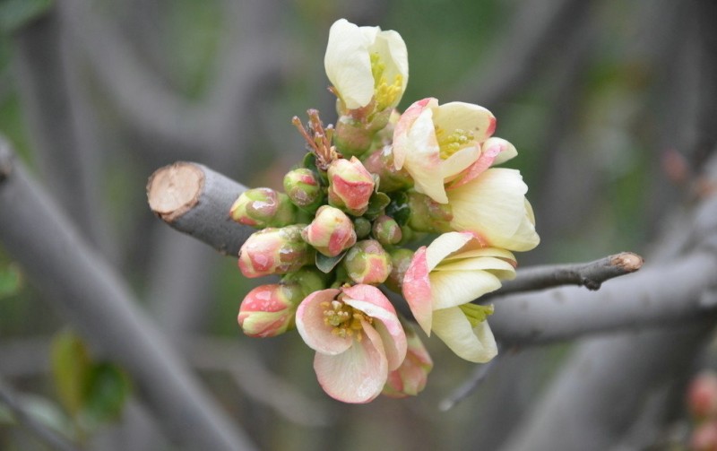 貼梗海棠花梗極短,花朵緊貼在枝干上,故而得名。