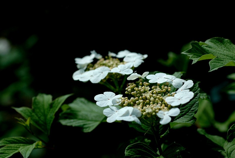 傘形聚傘花序頂生,緊密多花,由6~8小傘房花序組成,直徑8~10厘米,能孕花在中央,外圍有不孕的輻射花,總柄粗壯,長2~5厘米;花冠杯狀,輻狀開展,乳白色,5裂,直徑5毫米;花藥紫色;不孕性花白色,直徑1.5~2.5厘米,深5裂。