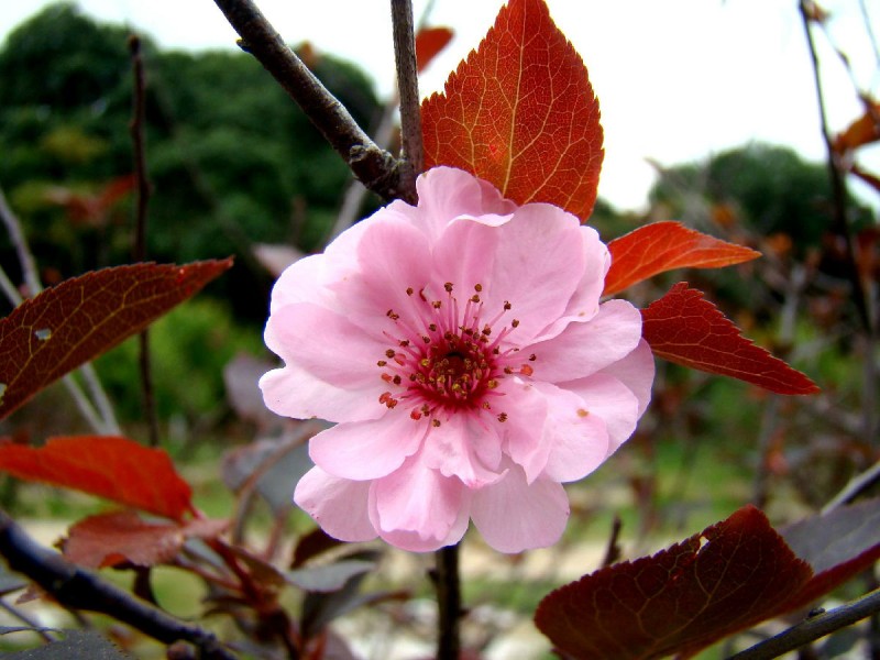 詳細的——紫葉李:為薔薇科李屬落葉小喬木,高可達8米,干皮紫灰色,小枝淡紅褐色,均光滑無毛,單葉互生,葉卵圓形或長圓形狀披針形,長3-4.5厘米,寬2-4厘米,先端短尖,基部楔形,緣具尖細鋸齒,羽狀脈5-8對,兩面無毛或背面脈腋有毛,色暗綠色或紫紅,葉柄光滑多無腺體,花單生或2朵簇生,白色,雄蕊約25枚,略短于花瓣,花部無毛,核果扁球形,徑1-3厘米,腹縫線上微見溝紋,無梗洼,熟時黃、紅或紫色,光亮或微被白粉,花葉同放,花期4月,果常早落。