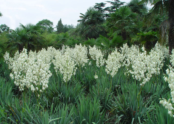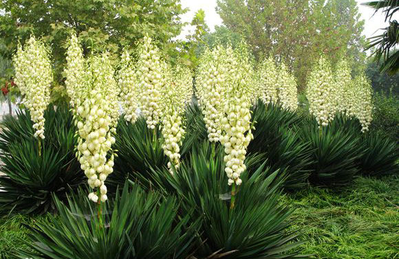 每年夏末秋初的交替季節(jié)中,是絲蘭大面積開花的季節(jié),而且白色的絲蘭花會開很久,因為觀賞效果極佳的絲蘭花期很長。絲蘭在開花的時候花莖很短,會有大片的簇生的絲蘭花緊密相連,并且絲蘭花枝是向上高聳綻放的;潔白的絲蘭散發(fā)著清幽奇特的花香,而大朵的絲蘭花垂下的姿態(tài)如鈴鐺一樣優(yōu)雅;絲蘭花會在夜間靜靜的開放,然后在讓大家觀賞的同時,吸引更多的花蛾取采花粉,然后間接的完成絲蘭花與生俱來的使命。