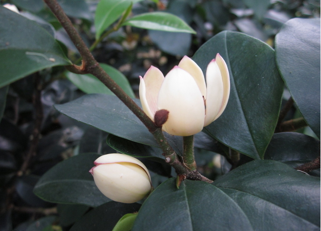 含笑花,拉丁文名:Michelia figo (Lour.)Spreng。常綠灌木,高2-3米,樹皮灰褐色,分枝繁密;葉革質(zhì),狹橢圓形或倒卵狀橢圓形,花期3-5月,果期7-8月。原產(chǎn)中國華南南部各省區(qū),廣東鼎湖山有野生,生于陰坡雜木林中。芳香花木,苞潤如玉,香幽若蘭。